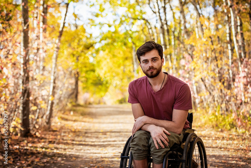 outdoors, confidence, happiness, portrait, photogenic, wheelchair, brown hair, self-assured, horizontal, day, success, sunny, youth, injury, impaired, seasonal, contented, disabled, handicapped, disability, paraplegic, eye contact, challenged, copy space, facial hair, one person, young men, autumn, color image, blue eye, young adult, blurred background, paralysis, paralyzed, front view, half-length