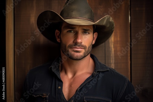 Portrait of a satisfied man in his 30s wearing a rugged cowboy hat against a rustic wooden wall. AI Generation
