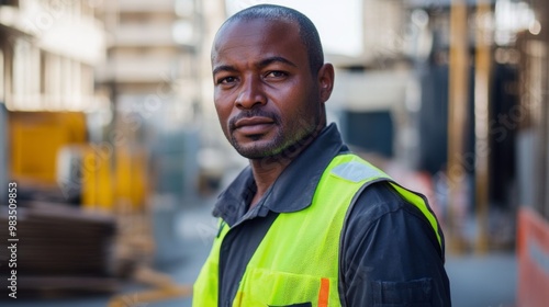 Portrait of a Serious Construction Worker Wearing a Yellow Safety Vest