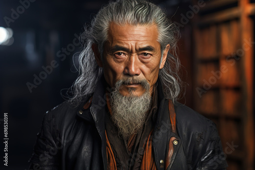 Portrait of a serious senior Asian man with long gray hair looking at the camera