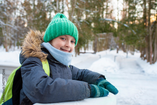portrait of a smiling boy in warm clothes and with a backpack in a snowy winter outside
