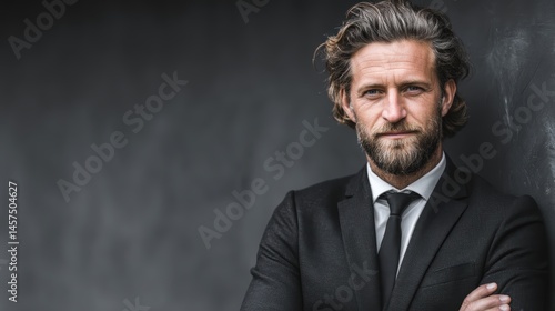 portrait, successful, lawyer, confidently, standing, black, suit, front, grey, background, confidence, authority
