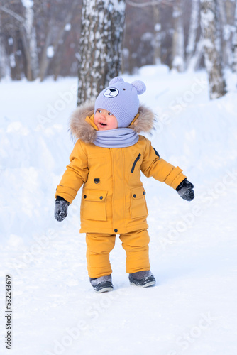 Portrait of a toddler 15-20 months old in yellow warm clothes looking back standing on a snowy path in the park