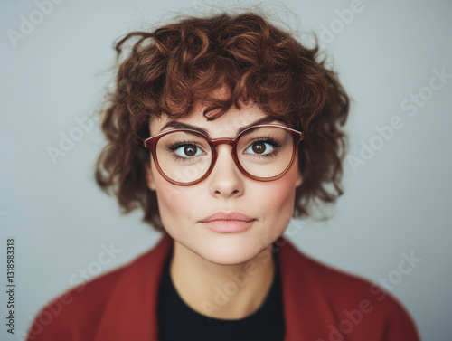 Portrait of a woman with curly hair and glasses against a neutral background