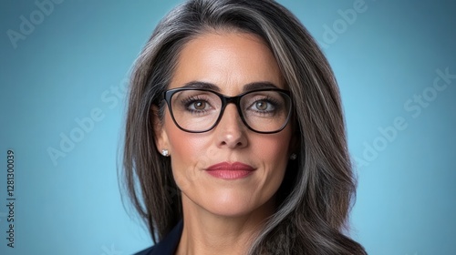 woman, portrait, goggles, serious, expression, brown, hair, long, blue, background, textured, professional, corporate, head shot, confident, determined, photo, studio, light, effect, female, adult, businesswoman, executive, leader, closeup, face, eye, neutral, calm, elegant, stylish, modern, contemporary, photo, image, portraiture, lifestyle, people, person, business