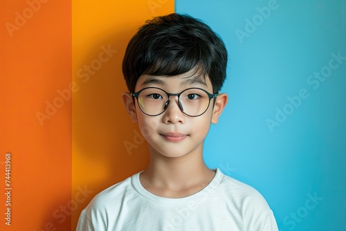 portrait of a young boy in a white t-shirt and glasses looking forward on a vertical geometric background