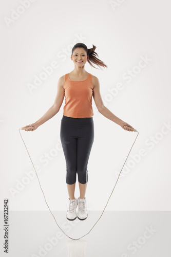 activity, adult, asian, bodycare, casual attire, exercise, exercising, fit, fitness, front view, full-length, health, health care, healthy lifestyle, healthy living, holding, indian, jumping, leisure, lifestyle, mid-air, 1, one person, people, ponytail, portrait, routine, skipping, skipping rope, smiling, activewear, studio shot, vitality, well-being, white background, woman, physical exercise, young adult, image, image, picture, picture, photograph, photograph, photo, photo, photograph