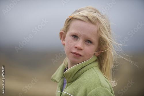 people, person, female, girl, youth, children, juvenile, children, young, portrait, body, face, look, looking, eye, blue, blond, long, hair, green, sweater, sweatshirt, outdoors, outside, scenery, nature, land, hill, craggy, slope, sloping