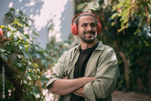 foliage, greenery, bush, tree, sunny, nature, privacy, listen, space, shirt, harmony, relaxation, calm, wireless, enjoy, playlist, song, background, lifestyle, earphones, closeup, standing, copy space, attractive, earphones, entertainment, caucasian, hipster, happy, smile, 1, technology, photogenic, young, earphones, sound, guy, music, modern, audio, man, cool, portrait, face, adult, person
