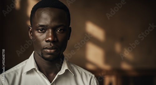 man, portrait, face, person, male, human, model, african, expression, serious, confident, calm, photogenic, young, adult, skin, eye, look, gaze, strong, powerful, dignified, gentleman, style, elegant, image, photo, photo, studio, lighting, shadow, dark, background, shirt, clothing, fashion, attitude, inner, soul, depth, sharpened