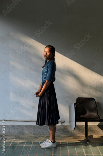 asia, attitude, casual attire, clothing, face, fashion, hair, indoor, lifestyle, model, modern, portrait, pose, shadow, skirt, sneaker, standing, style, summer, sunlight, sunset, sweater, thai, wall