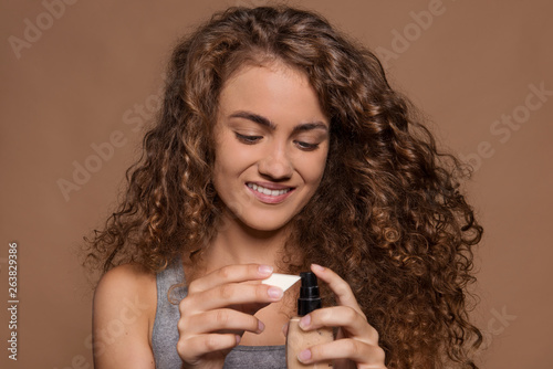 woman, girl, 1, female, young, teenage, teenage, youth, beautiful, pretty, attractive, adult, person, portrait, model, caucasian, studio, shot, beauty, background, casual attire, natural, cheerful, happy, hair, curly, fashion, style, coiffure, isolated, looking, copy, space, empty, blank, expression, standing, product, make-up, brown, applying, sponge, cover