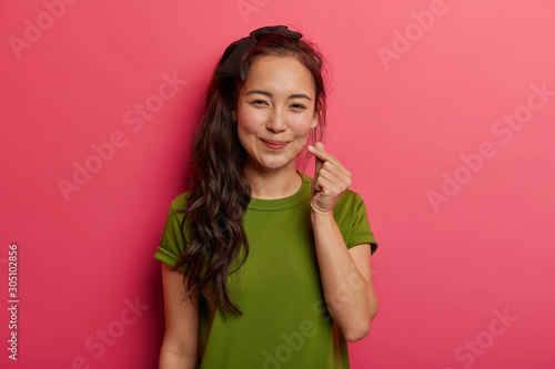asian, female, gesture, happy, nubes, love, mini, people, showing, woman, young, adult, girl, person, romantic, shape, signs, success, symbol, background, care, confident, face, isolated, lady, portrait, romance, smile, happiness, little, making, show, finger, idea, natural, korean, brunette, t-shirt, green, casual attire, wear, pink, rose colored, wall, teenage, ponytail, standing, 1, optimistic