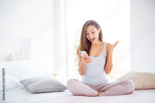 Portrait of amazed surprised girl sitting on bed with unexpected unbelievable expression using smart phone enjoying good news day health healthy