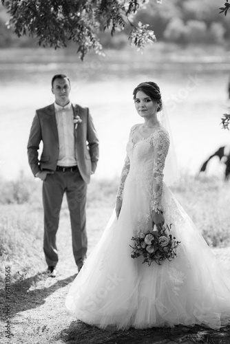 beige, blue, bridal bouquet, brown, butterfly, deciduous, dress, flower, forest, forever, grass, green, groom, ground, love, path, human relationships, summer, veil, walk, wedding