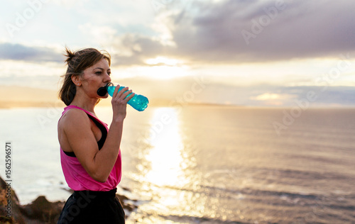 active, athlete, balance, black, blue, bottle, calm, cliff, coast, drink, earbud, energy, fitness, gaze, hair, healthy, hydrating, hydratation, light, nature, ocean, outdoors, pink, portrait, refresh, rest, runner, scenic, skin, sky, sporty, strong, sun, sunset, trail, training, water, wellness, woman