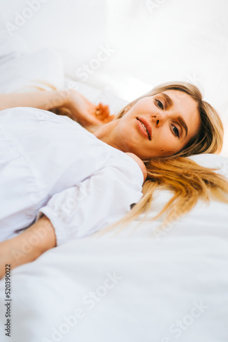 Portrait of attractive caucasian happy woman with blonde hair, lying on a bed with white blanket on sunny day.