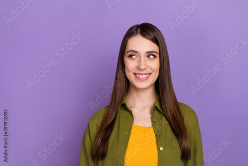 Portrait of attractive cheerful brown-haired girl thinking copy empty space isolated over violet purple color background