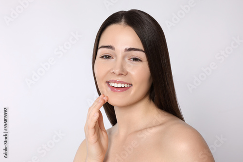 Portrait of attractive young woman on light grey background. Spa treatment