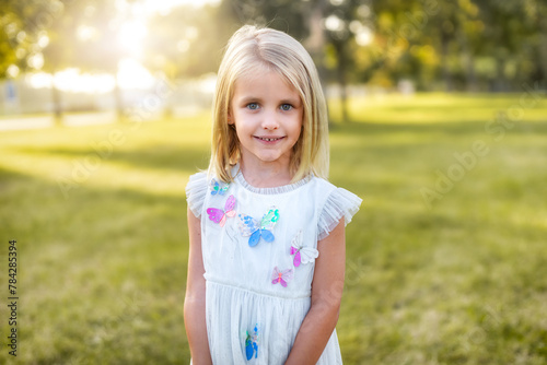 Portrait of beautiful smiling happy child's face. Pretty little girl with blond hair in a white dress posing summer nature outdoor. Kids portrait in the park