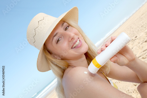 Portrait of beautiful woman applying sunblock on her skin