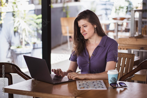 Portrait of beautiful woman working on laptop while sitting in cafe with coffee in paper cup