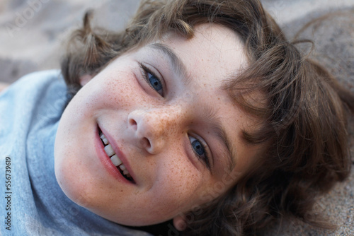 outdoors, daytime, brunette, caucasian, closeup, delight, innocence, children, holiday, smile, happy, human, alone, sweet, children, vacation, get-away, beach, relax, youth, individual, image, portrait, content, pure, casual attire, childlike, grin, person, trip, freckle, lie, picture, 1, photograph, boy, youngster, summer, humanity, preteen, sandy, head shot, eye contact, lying down, juvenile, young boy, en, one person