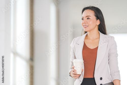 Portrait Of Cheerful Asian Business Woman Holds Take Away Coffee And Digital Tablet in Company