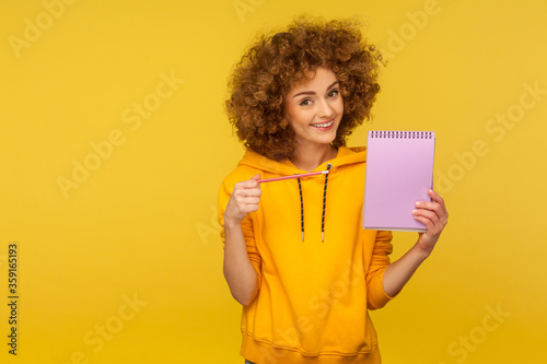 Portrait of cheerful curly-haired woman in urban style hoodie showing pencil and paper notebook to write idea, looking at camera with toothy smile. indoor studio shot isolated on yellow background