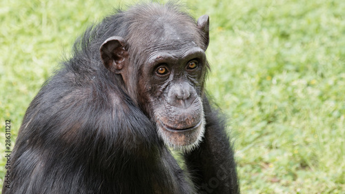 animal, monkey, chimpanzee, africa, hairy, look, expression, green, background, focused, sitting, endangered, behaviour, clever, mouth, gazing, staring, closeup, intelligence, zoo, adult, black, funny, eye, wild, portrait, chimpanzee, ape, african, face, nature, wildlife, mammal, primate, cute