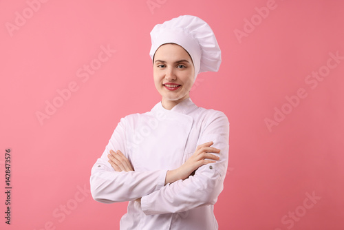 adult, arm, background, baker, bakery, beautiful, cafes, caucasian, chef, coat, confection, confectioner, confectionery, cook, cooking, crossed, cookery, culinary, delicious, dessert, female, food, fresh, gastronomy, happy, hobby, job, occupation, pastry, person, pink, portrait, production, professional, receipe, eatery, smiling, sweet, toque, uniform, woman, work, young