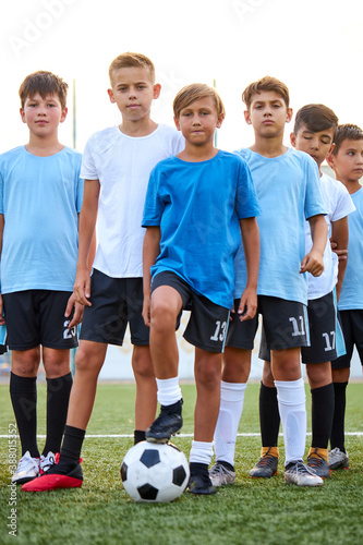 portrait of confident team of young football players posing at camera, athletic boys in uniform going to play football or soccer. in stadium