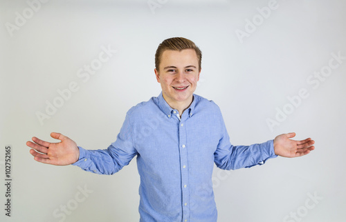 boy, gesture, hand, happy, smiling, fun, emotion, portrait, adorable, background, beautiful, caucasian, cheerful, children, cute, expression, face, feeling, front, photogenic, happiness, joy, children, laughing, people, person, positive, pretty, shirt, smile, studio, teenage, teenage, white, young, youth