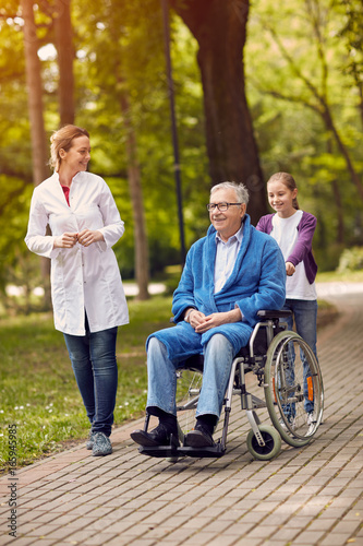 portrait of elderly man on wheelchair with nurse and granddaughter outdoor.