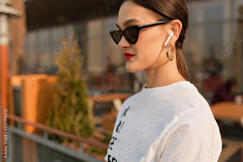 Portrait of elegant girl with collected dark hair walking on street on old building background. Woman in white t-shirt and red lips. She is smiling to camera.