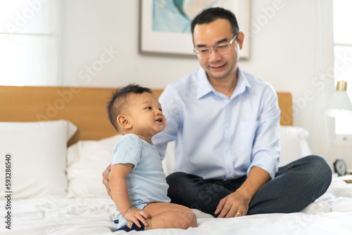 Portrait of enjoy happy love family asian father playing with adorable little asian baby.newborn, infant.dad touching with cute son moments good time in a white bedroom.father day, Love of family