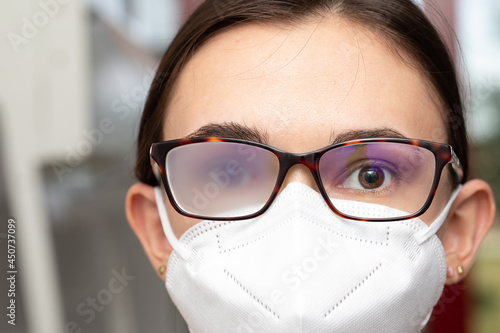 portrait of girl with mask and one lens of glasses fogged and the other not