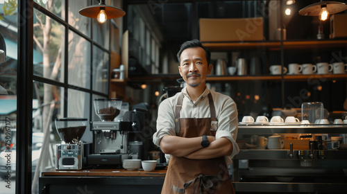 Portrait of happy young Asian man small business owner of coffee shop standing at entrance wearing apron