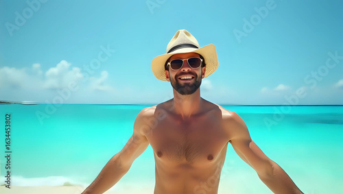 Portrait of happy bearded man wearing sun hat and sunglasses, beautiful tropical paradise beach with turquoise ocean water background and clear blue sky - summer vacation lifestyle concept