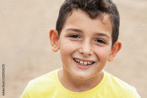 Portrait of happy cute child boy outdoors. Concept of happy family or successful adoption or parenting.