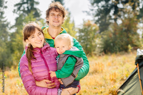 Portrait of happy family mother, father and toddler son wearing colorful duck jacket are traveling on Carpathain mountains. Traveling with children, tourism and people concept. Copy space.