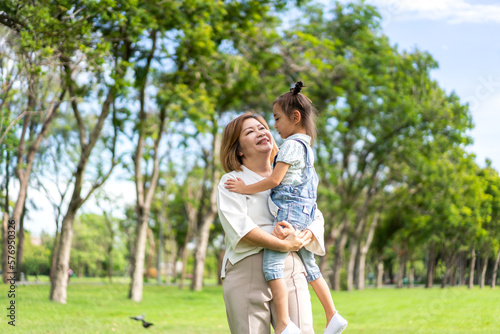 Portrait of happy love asian grandmother and asian little cute girl enjoy relax in summer park.Young girl with their laughing grandparents smiling together.Family and togetherness