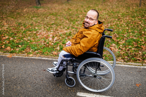 paraplegic, wheelchair, disability, handicapped, man, nature, hobby, leisure, activity, park, sitting, enjoying, relaxing, joy, pleasure, disease, diversity, happy, smiling, cheerful, equal, lifestyle, healthy, disabled, people, accessibility, problem, issue, pathway, health care, equipment, hope, portrait, city life, autumn, one person, adult, black hair, eyeglass, real people, male