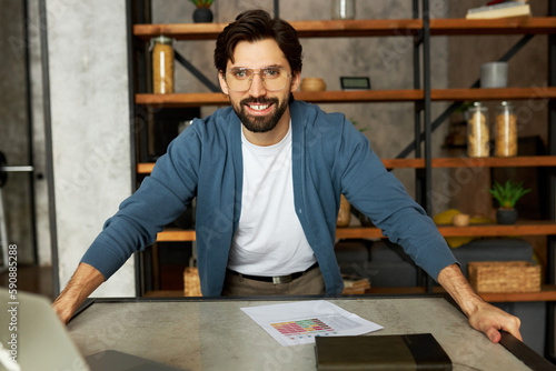 cheerful, smiling, positive, bossy, decisive, confident, powerful, table, computer, business, report, executive, ceo, entrepreneur, standing, office worker, loft, working, man, home, businessman, job, online, professional, career, freelance, men at work, occupation, finance, laptop, notebook, interior, technology, trader, broker, financial, analyst, investment, diagram, paper, document, goggles, eyewear, spectacle, male, guy, bearded, manager