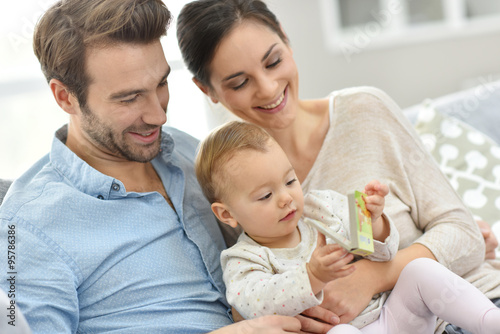 man, woman, family, baby, children, couple, guy, portrait, love, embracing, tenderness, smile, smiling, sitting, sofa, couch, relaxing, togetherness, parenthood, little girl, indoor, interior, middle-aged, 30s, 30s, european, caucasian, adult, people, casual attire, happy, investment, home, house, apartment, project, enjoying, cheerful, fun