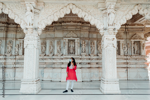 Portrait of Indian female model in mask standing at temple and looking at carving on wall. New normal travel Concept of wearing mask at public places