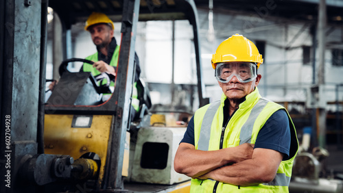 Portrait of industrial worker driving a forklift in the factory. Engineer is working and maintaining in the warehouse.