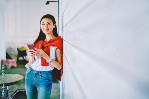 Portrait of japanese young woman smiling at camera while updating app on mobile phone using 4g internet standing near publicity area for business information.Chinese hipster blogger chatting online