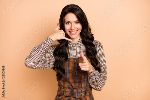 Portrait of lovely cheerful wavy-haired girl showing phone sign call me pointing at you isolated over beige pastel color background
