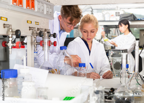 Portrait of male and female scientists in white coats working at biochemical laboratory